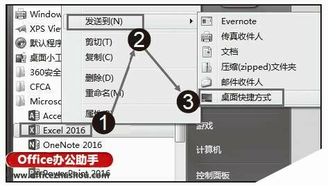 步骤1:在桌面上单击左下角的“开始”按钮,在展开的菜单中依次单击“所有程序|Microsoft Office|Microsoft Office Excel 2016”,然后单击鼠标右键,在展开的下拉菜单中单击“发送到|桌面快捷方式”选项,如图2所示。
