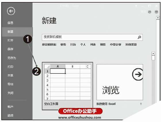步骤1:在Excel 2016主界面中,依次单击“文件|新建”选项,打开“新建”窗口,如图7所示。
