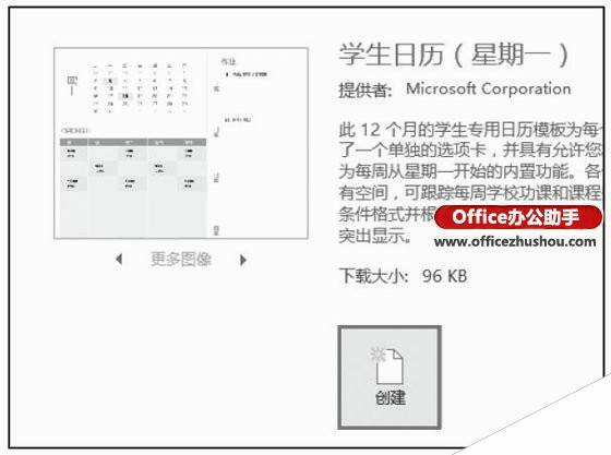 步骤2:在“模板”列表中显示了多种工作簿模板,选中要使用的模板单击,如此处选择“学生日历”模板,在弹出的“学生日历”模板预览中单击“创建”按钮,如图8所示。