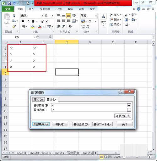 点击全部替换,你会发现表格里面的单元格内容全部都变成了×,这个效果可不是我们需要的。