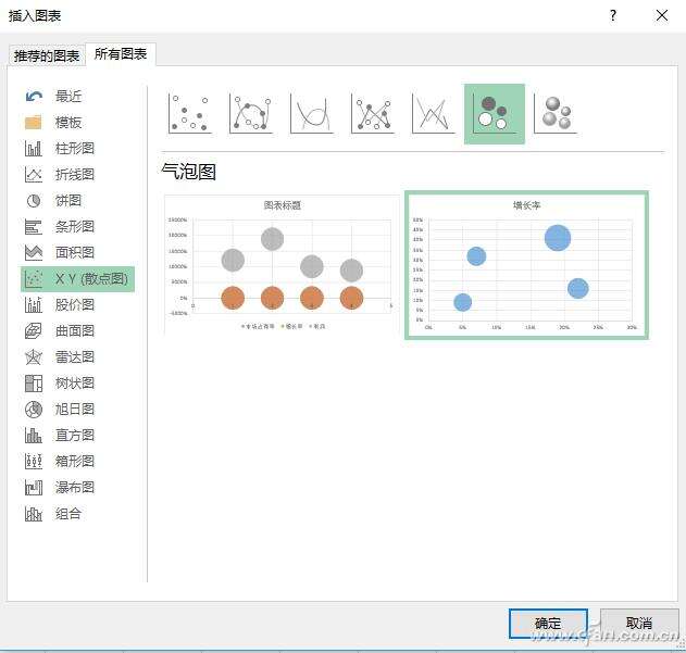 选中实例中的数据,点击“插入→图表→所有图表→XY散点图”,选择其中的“气泡图→增长率”,在表中插入一个常规的气泡图表(图2)。