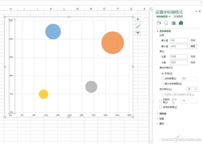 为了使得最终矩阵图可以更直观地表示出产品的特性,这里需要对坐标轴的数据进行设置。比如纵坐标表示的是市场占有率,案例中最大值是22%,可以将最大值设置为25%。选中纵坐标右击选择“设置坐标轴格式“,将其最大值设置为0.25(如果有负数,则需将最小值设置为对应的负数)。同理设置横坐标的数值,这样调整后可以让产品的分布更加均匀(图5)。