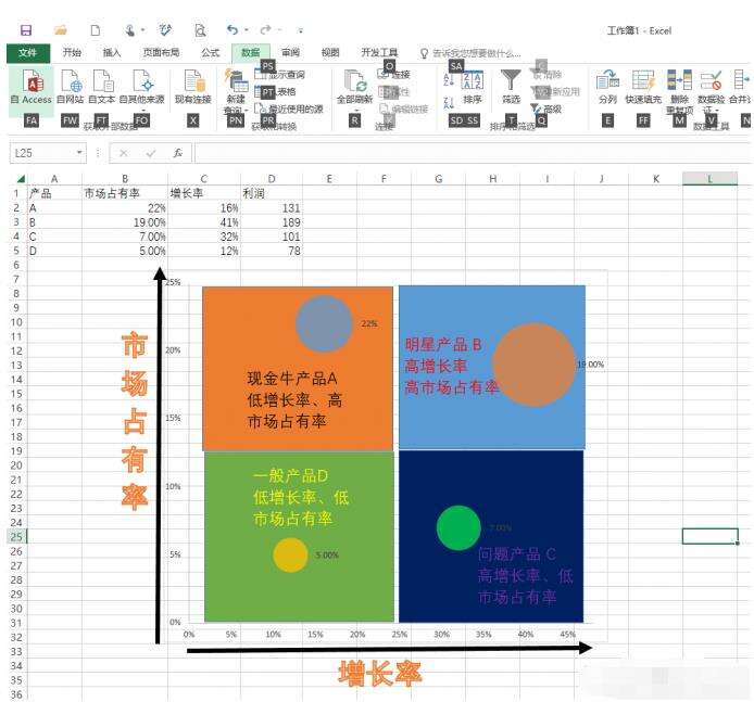 通过矩阵图片结合X轴、Y轴就可以方便完成矩阵图的制作,如果还有其他产品,我们只要输入数据后重新生成对应的气泡数据,这样只要查看气泡落在矩阵图象限位置,我们通过位置就可以很直观看出产品属于哪种性质了,这样三维矩阵图表是不是更好用?
