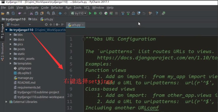 打开Pycharm开发工具,右键单击项目选择settings选项,如下图所示