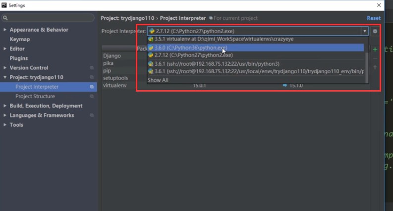 展开project选项,选择其下面的Project Interpreter选项,如下图所示