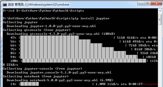 直接在cmd中输入 :pip install jupyter即可自动下载安装。