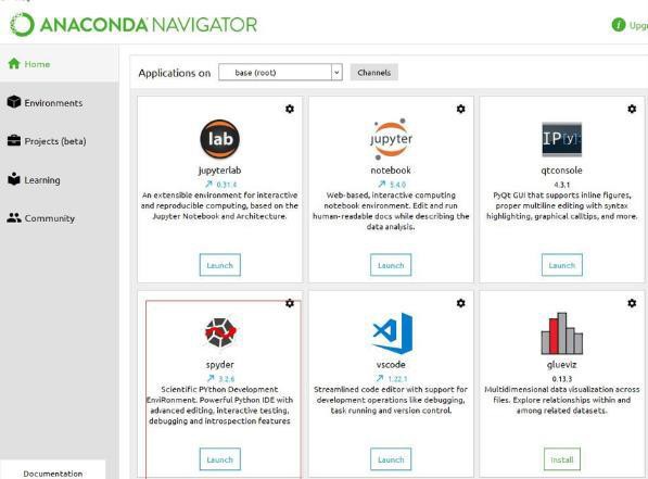 在anaconda图形界面找到spyder,然后点击图标下的按钮即可启动。