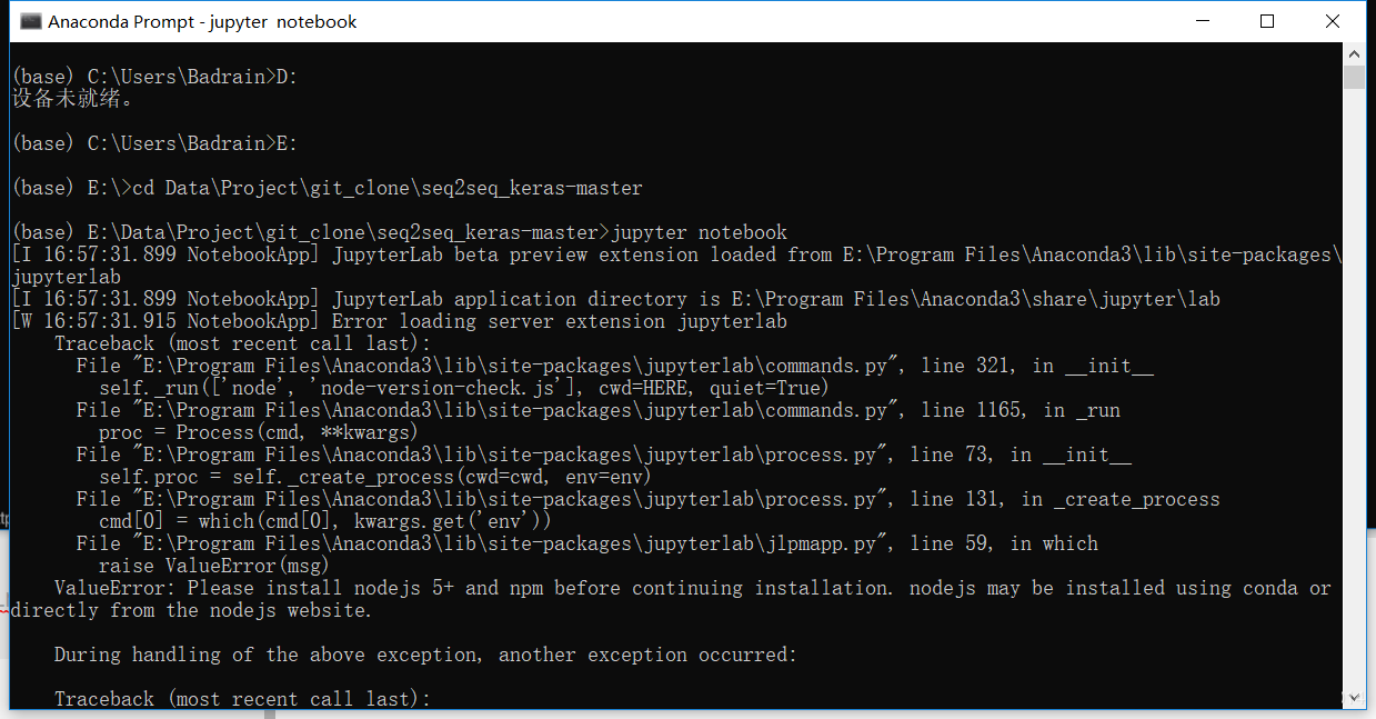 这里我们不使用原来点击应用程序的方法,而使用命令行启动。在命令行中输入jupyter notebook后回车启动。