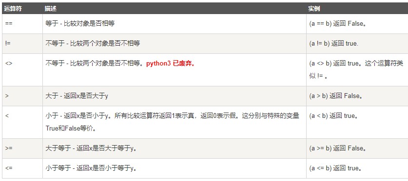 比较运算符,也成关系运算符,用于对常量、变量或表达式的结果进行大小、真假等比较,如果比较结果为真,则返回 True;反之,则返回 False。