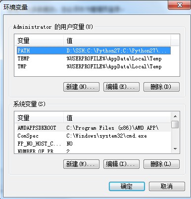 然后我们来设置一下用户变量中的PATH变量,用鼠标选择Administrator的用户变量中的PATH,然后点击编辑,在最后加上 “;C:Python27Libsite-packagesdjangoin”注意不要漏掉开头的那个分号。然后一路确定退出。