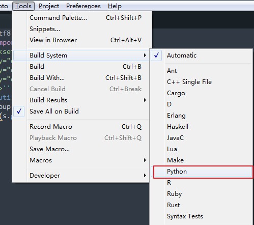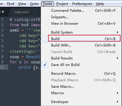 修改好之后我们点击保存,我们点击"Tools/Bulid System/Python",如图所示:
