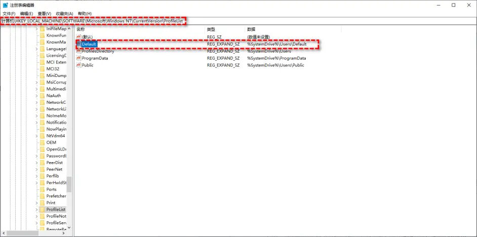 通常,Default字符串的数值数据是“%SystemDrive%\Users\Default”。但是,因为种种原因可能会使这个值发生变化。因此,想要解决user profile service服务未能登录问题,需要你手动检查并更改这个文件的值。同“方法一”一样,需要先进入安全模式打开隐藏的管理员账户,然后按照以下步骤操作: