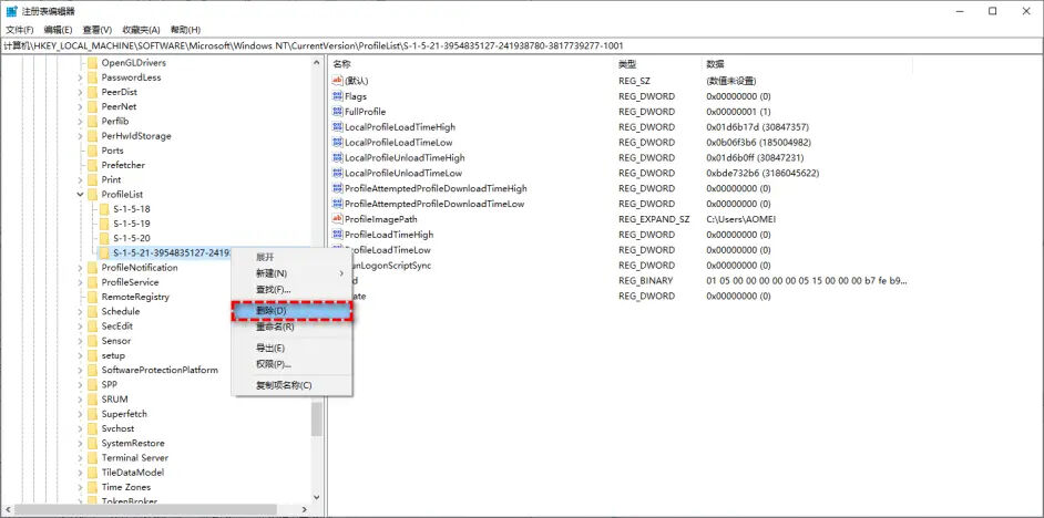 1、还是在这个目录中,右键点击“S-1-5-xx-xxxxx”选择“删除”。