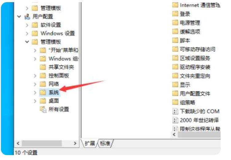 2、待本地组策略编辑器弹出后,在左侧边栏依次点击“用户配置”、“管理模板”、“系统”。