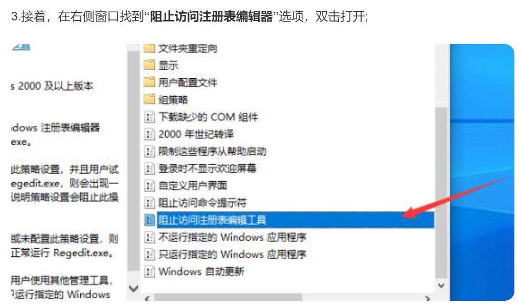 3、接着,在右侧窗口找到“阻止访问注册表编辑器”选项,双击打开。