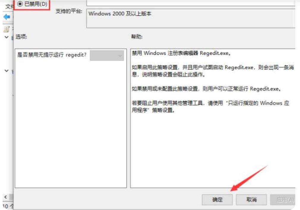 4、最后,将“阻止访问注册表编辑器”选项设置为已禁用即可。
