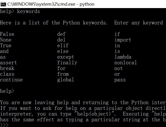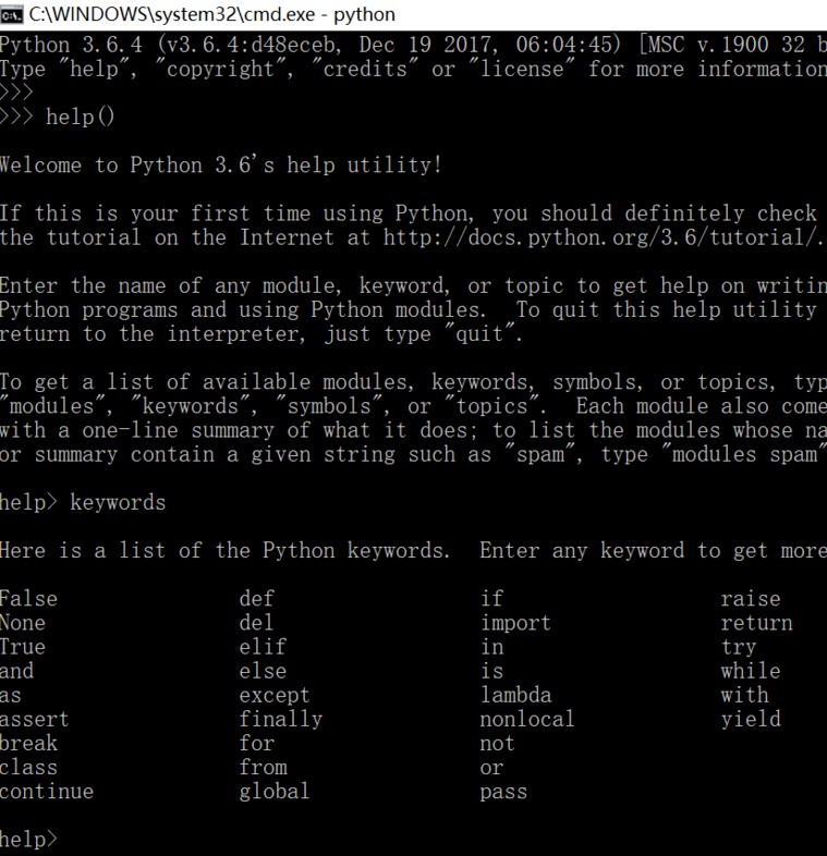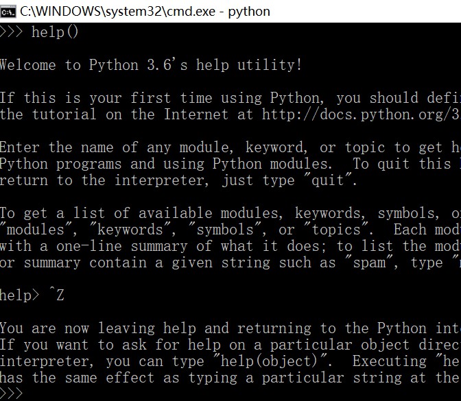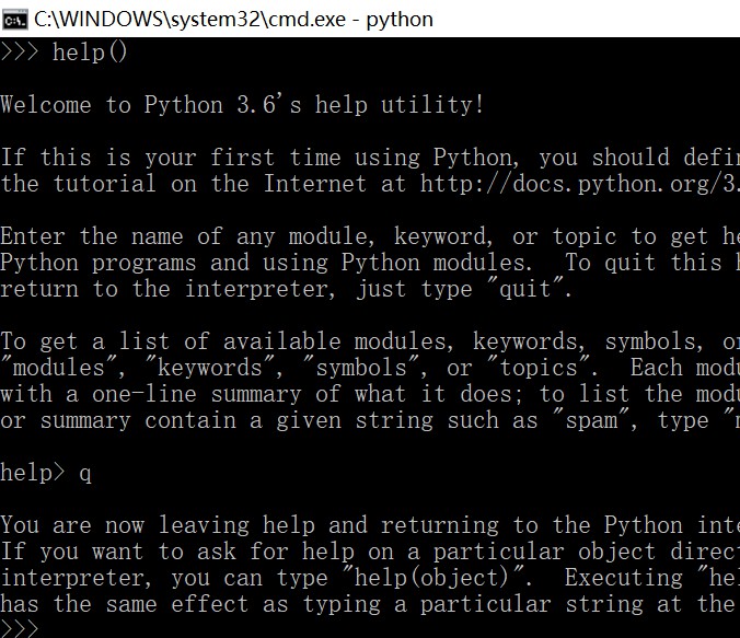 Python3的Python的交互式编程模式">>>"下输入“help()”命令,执行后会进入“help>”。