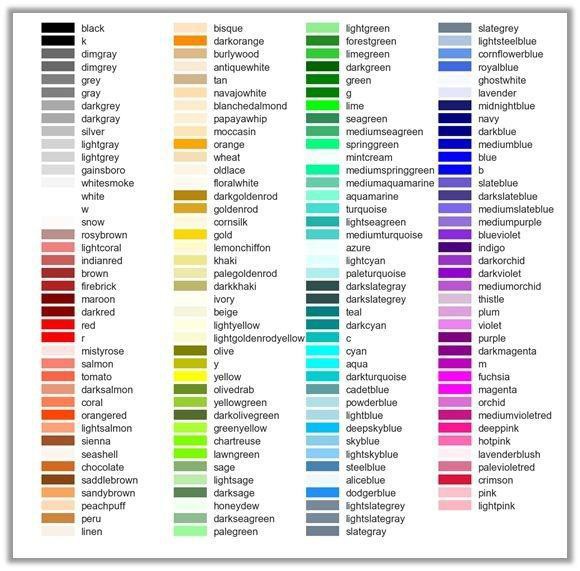 在turtle库中,有许多颜色可供画图使用,以下的色板中,大多数颜色在turtle中都是可使用的。