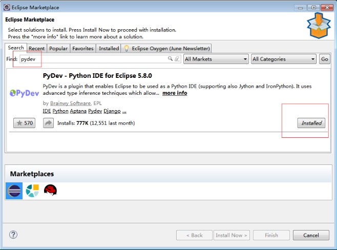 启动Eclipse,点击Help —> Eclipse Marketplace,输入“pydev”查找python插件进行安装。