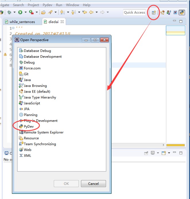 安装完后,重启Eclipse,会发现多了一个PyDev视图,如下图: