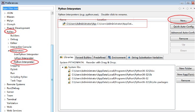 安装完成后,打开Eclipse —> Preferences,找到Python Interpreters,点击new找到python安装程序,点击ok,添加进来。