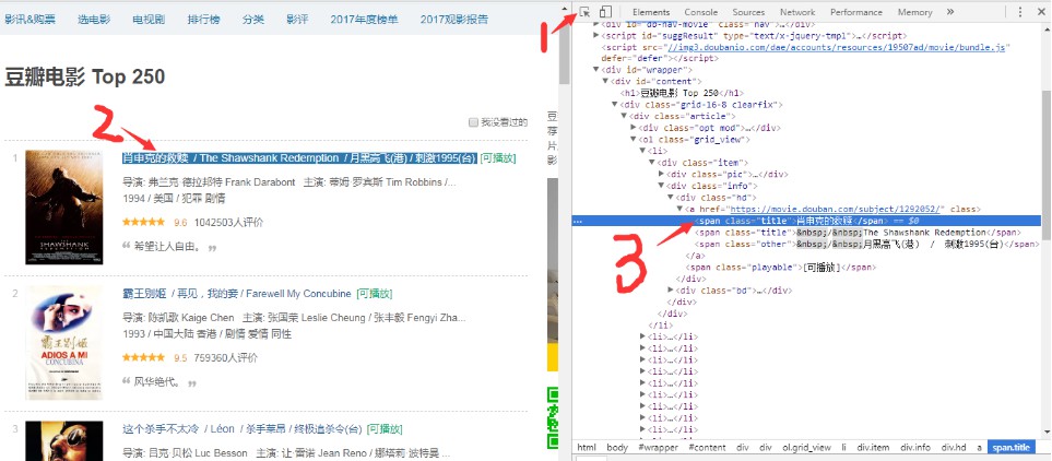 如何找到信息在html中的位置呢,首先鼠标右键检查,打开当前网页的html代码。然后先单击箭头1处的箭头,把鼠标移动到你要查找的信息上,如箭头2处的电影名:肖申克的救赎 ,右边就会显示你点击信息在html代码中的位置(箭头3)。一个网页的html代码全部打开看上去会非常的繁多,其实html代码是一层一层结构化的,非常规整的。每一对尖括号包起来的是一个标签,比如箭头3的<span> ……</span>,这就是一个span标签。span叫标签名,class="title"是标签的属性,“肖申克的救赎”是标签的内容。