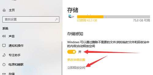 4、将存储感知的开关打开,再点击下方的立即释放空间