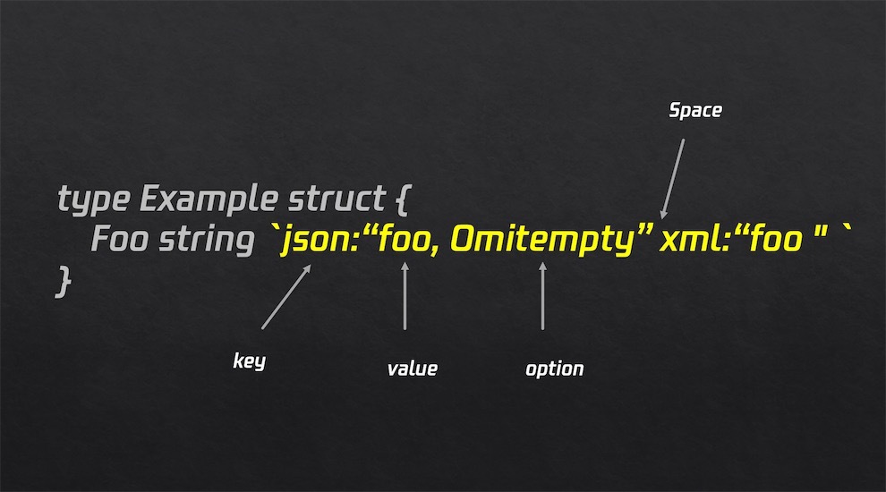 在定义上,它以 key:value 的形式出现,跟在 struct 字段后面,除此之外,还有以下几点需要注意: