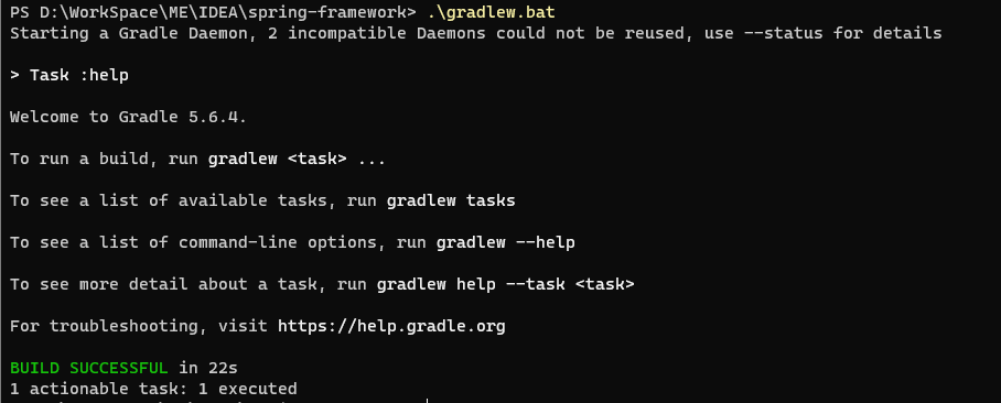 在 spring-framework源码目录中打开 cmd 命令行,执行 .gradlew.bat 命令进行构建,该过程会持续一段时间,我们不妨去歇下来稍事等待。