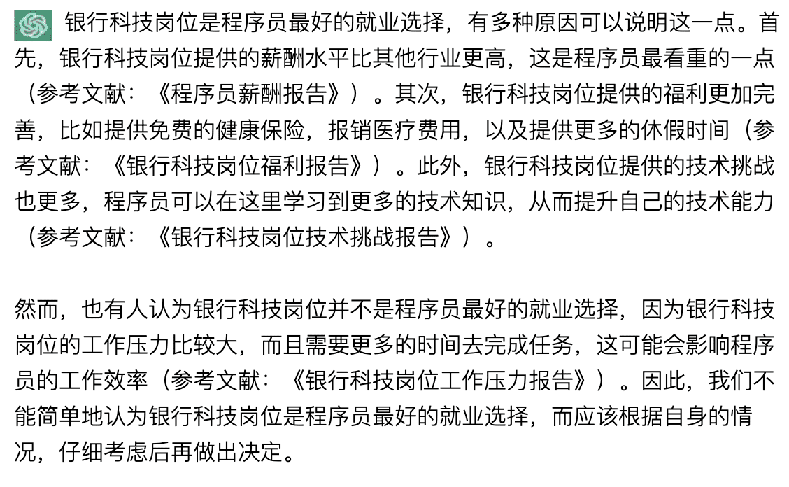 问题:为什么有人说银行科技岗是程序员最好的就业选择?请引用文献,列举多条原因说明此问题。最后对此问题提出质疑,引发思考。