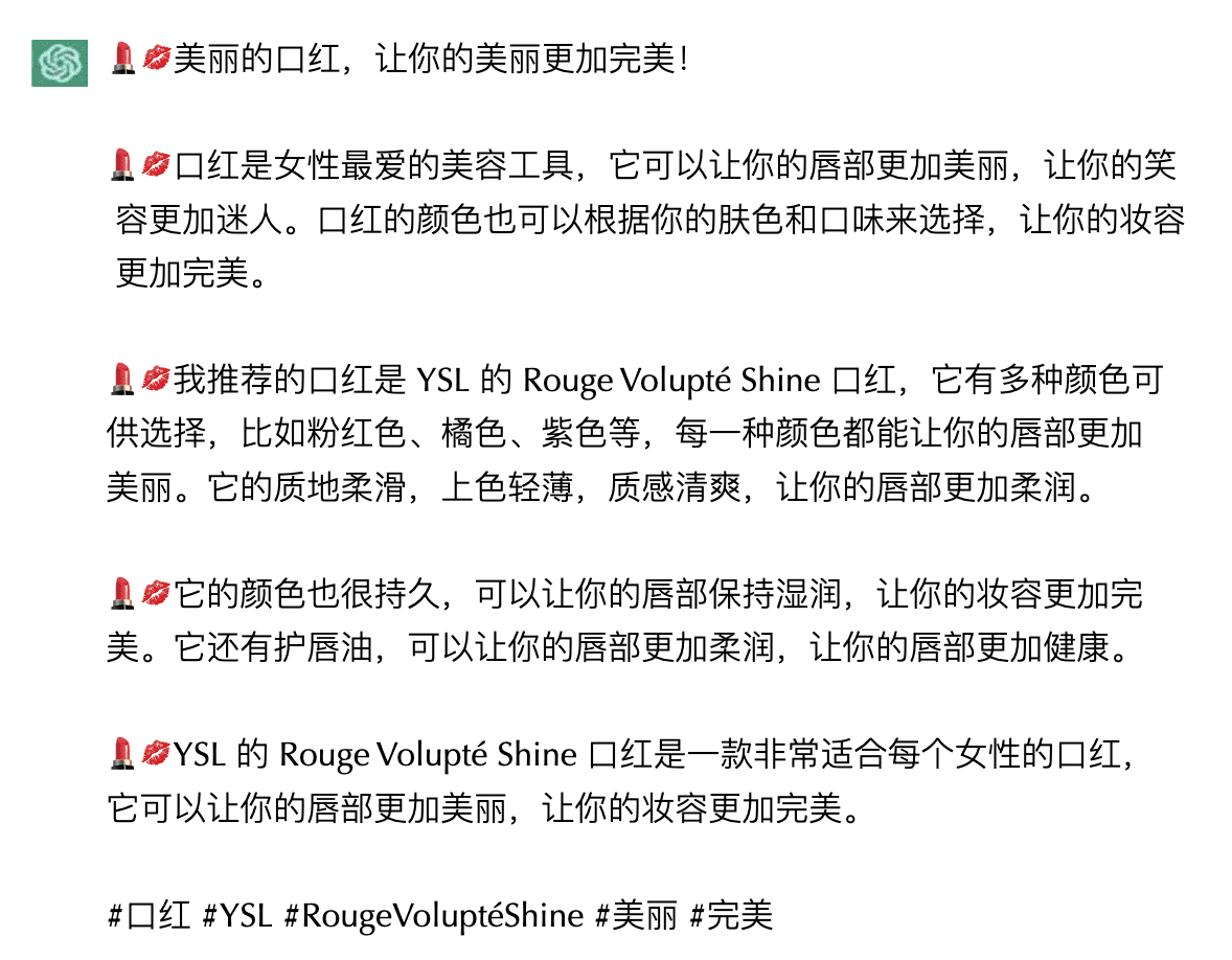 问题:用很吸引人眼球的标题,每个段落都加 emoji 表情,最后加一些tag,推荐一只好看的口红。需要超过200字