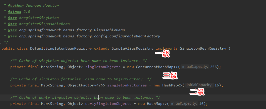 第三级缓存:singletonFactories,存放可以生成Bean的工厂。