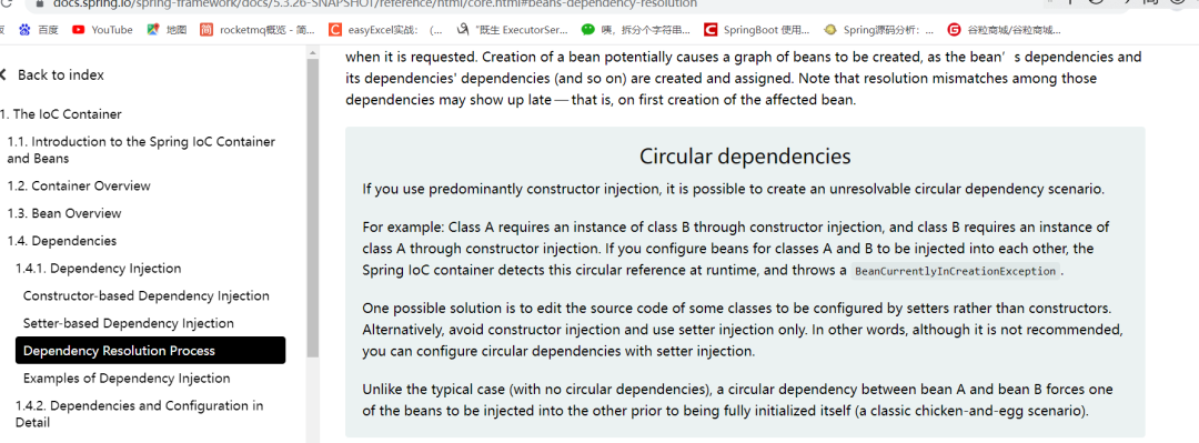 上面是对Spring循环依赖的简单解释,下图是Spring官网说明。