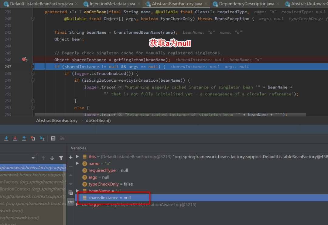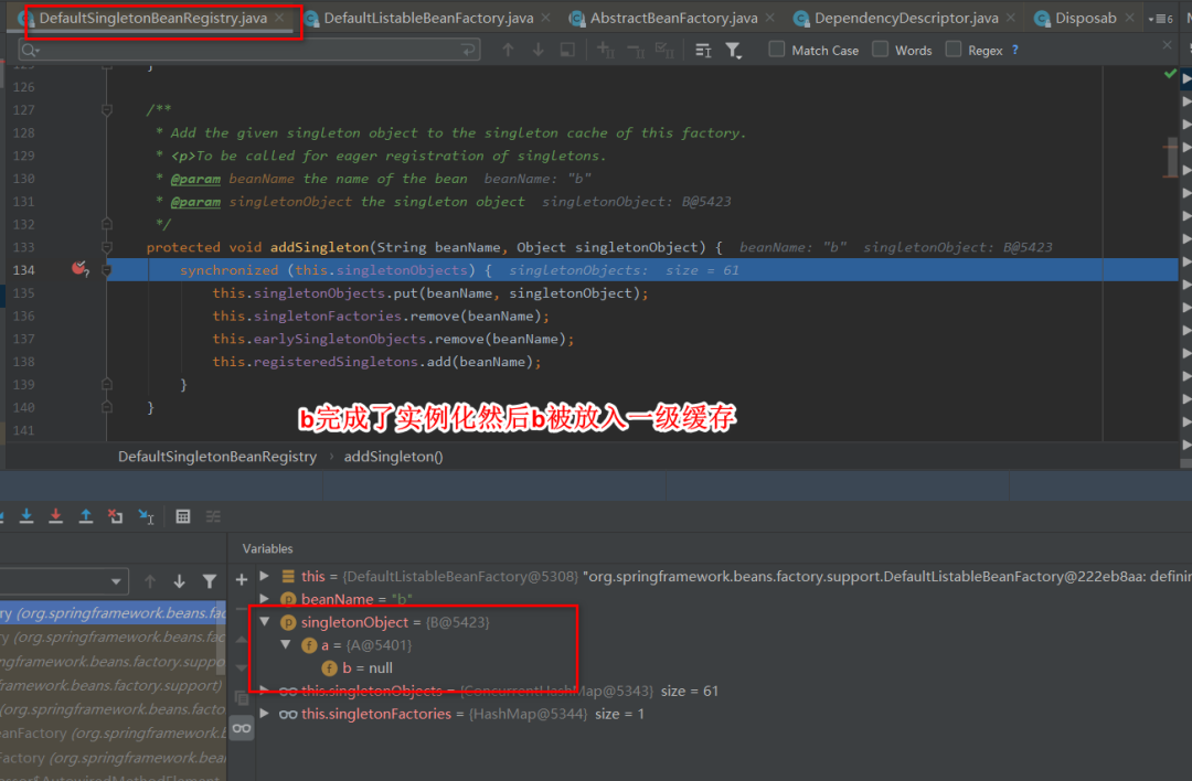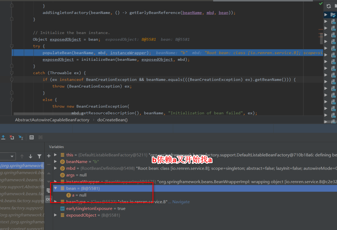 8:此时b依赖于a,调用getSingleton获取a,依次从一级,二级,三级缓存中找,此时从三级缓存中获取a的创建工厂,通过创建工厂获取到singeltonObject,此时这个singletonObject指向的就是上面的doCreateBean方法中获取的实例化的a。
