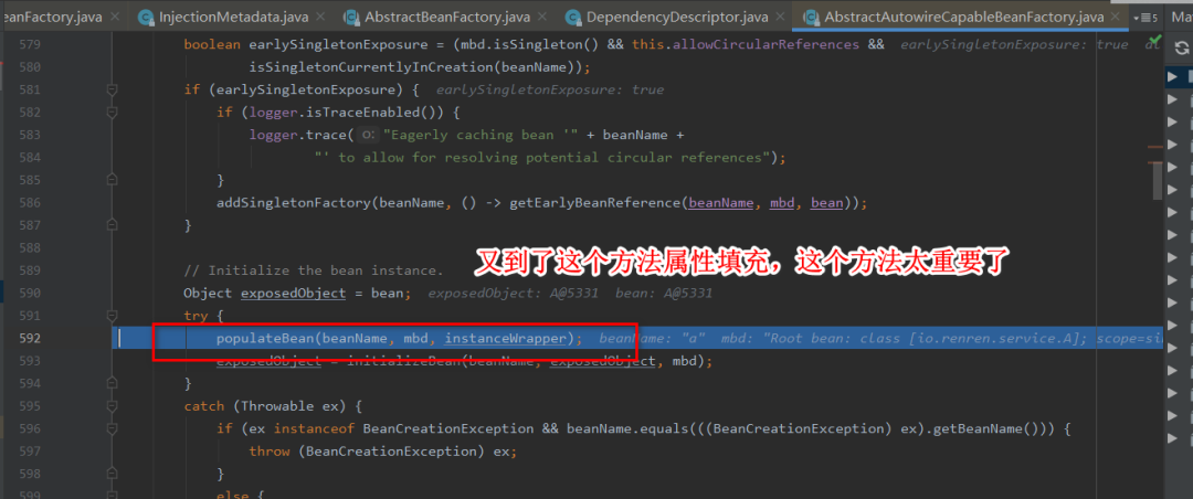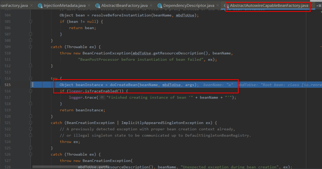5:进入AbstractAutowireCapableBeanFactory的doCreateBean,创建出a的实例然后将a添加到三级缓存中。