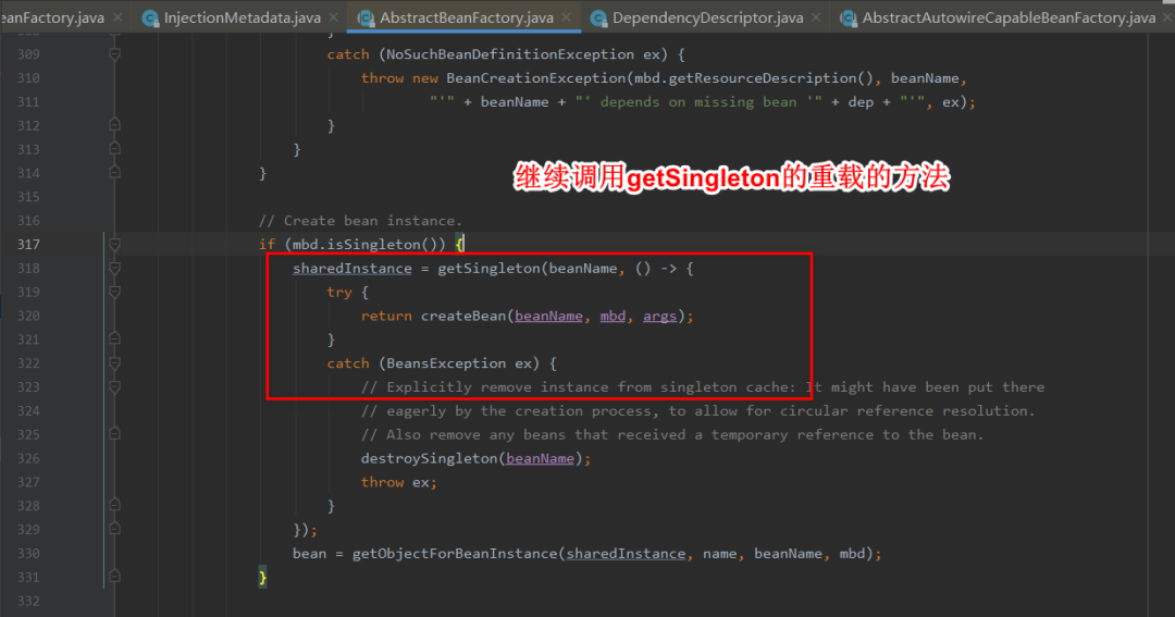 3:如果getSingleton()方法中获取到的a为null ,于是走对应的逻辑处理,调用getSingleton的重载的方法(参数为ObjectFactory)。