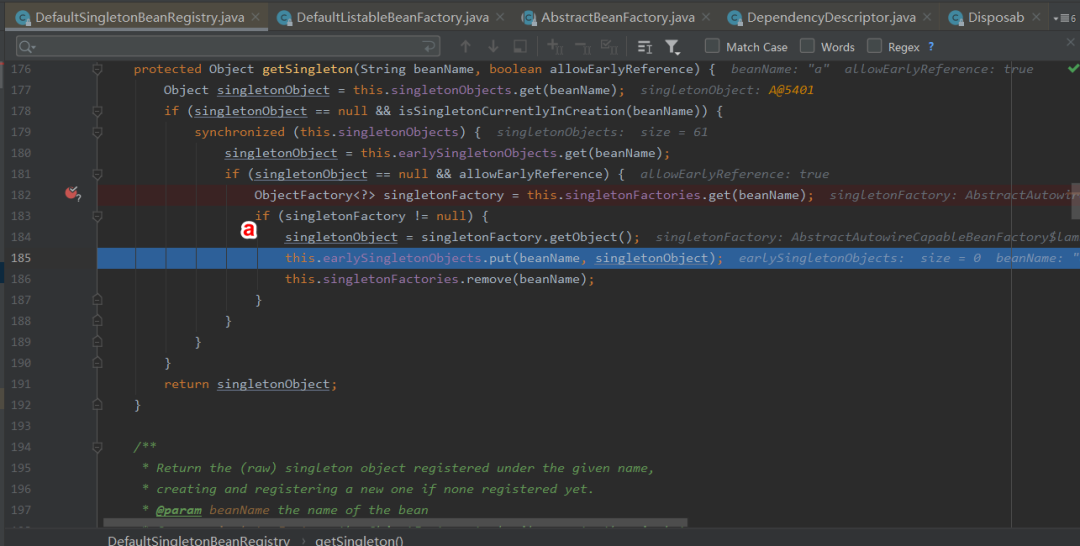 1:调用doCreateBean()方法,想要获取a ,于是调用getSingleton()方法从缓存中获取a 。