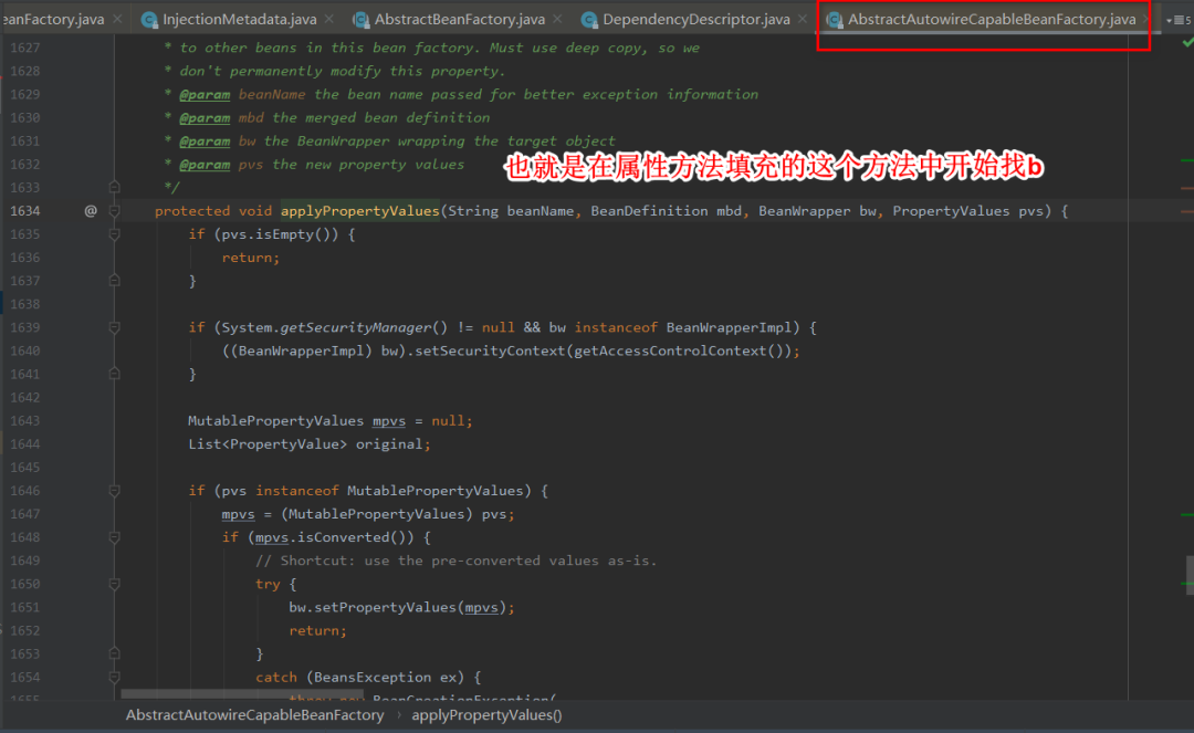6:对a进行属性的填充,此时检测到a依赖于b,于是开始找b 。