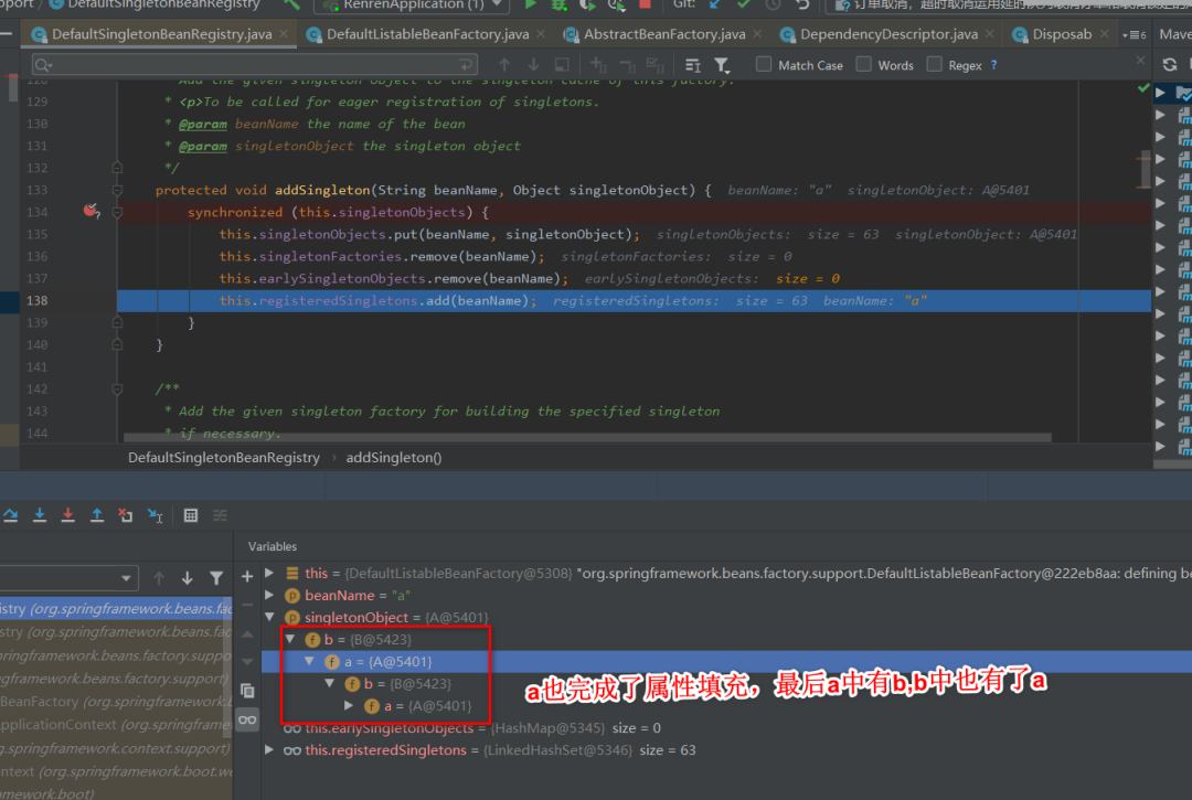 7:找b的时候调用doGetBean()方法和上面创建a的过程一样,到缓存中找b,没有则创建,然后给b填充属性。