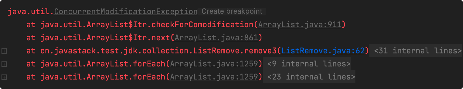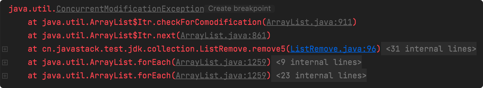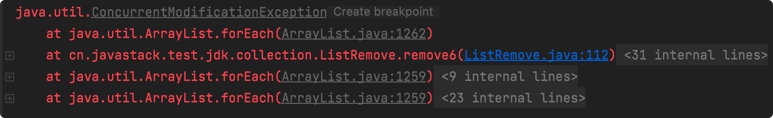 forEach 方法的背后其实就是增强的 for 循环,底层即迭代器,所以使用 list.remove 同样抛出 ConcurrentModificationException 异常。