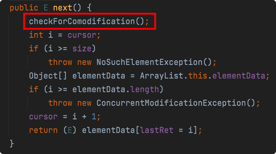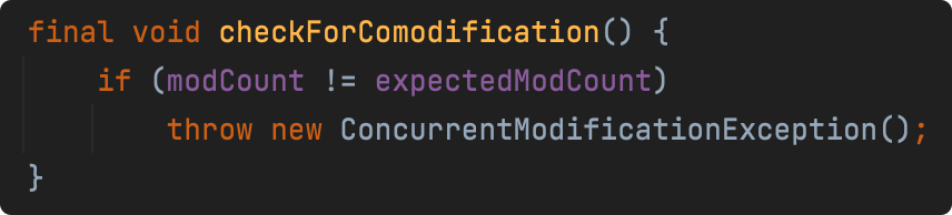 取下个元素的时候都会去判断要修改的数量(modCount)和期待修改的数量(expectedModCount)是否一致,不一致则会报错,而 ArrayList 中的 remove 方法并没有同步期待修改的数量(expectedModCount)值,所以会抛异常了。