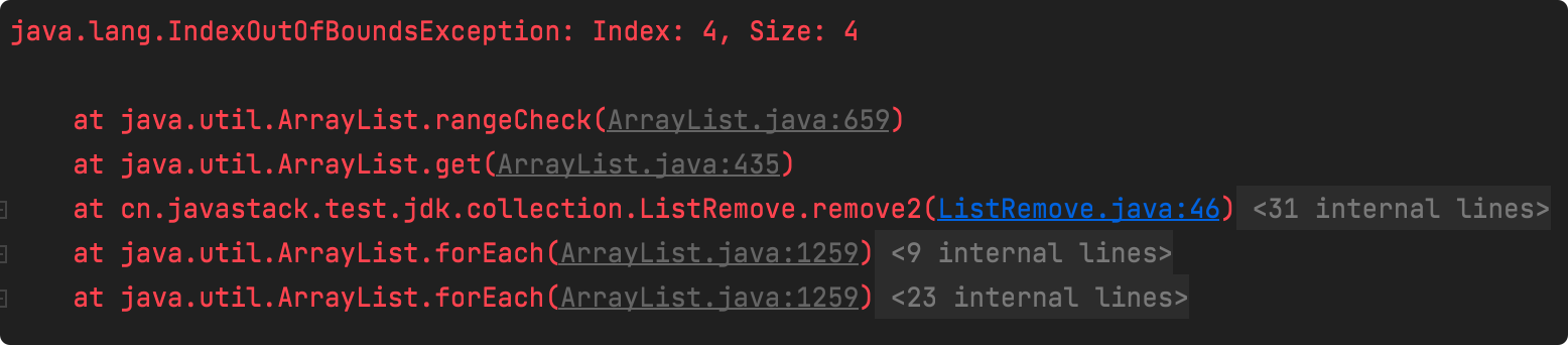 这里也很明显,因为 size 变量是固定的,但 list 的实际大小是不断减小的,而 i 的大小是不断累加的,一旦 i >= list 的实际大小肯定就异常了。