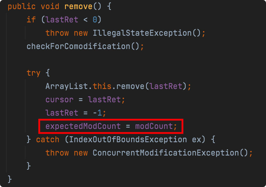 结果输出正常,这是因为迭代器中的 remove 方法将期待修改的数量(expectedModCount)值进行了同步: