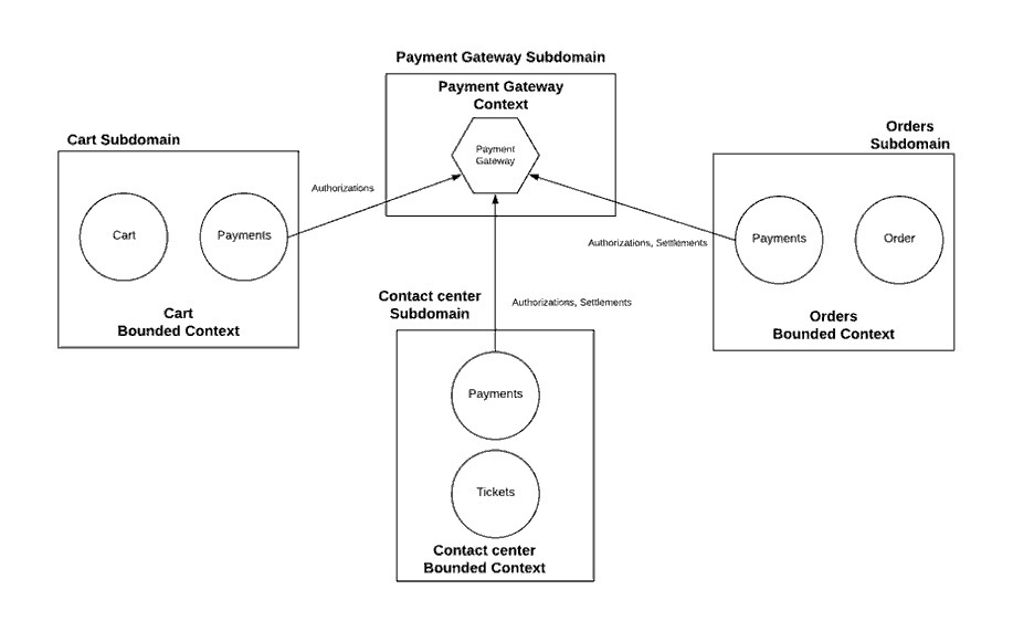 上下文映射的完整探索不在本博客的讨论范围之内,但我们将通过一个示例进行说明。下图显示了处理电子商务订单付款的各种应用程序。