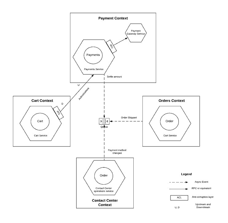 - 购物车上下文负责订单的在线授权;订单上下文流程过帐付款后的付款流程;联络中心会处理所有例外情况,例如重试付款和更改用于订单的付款方式