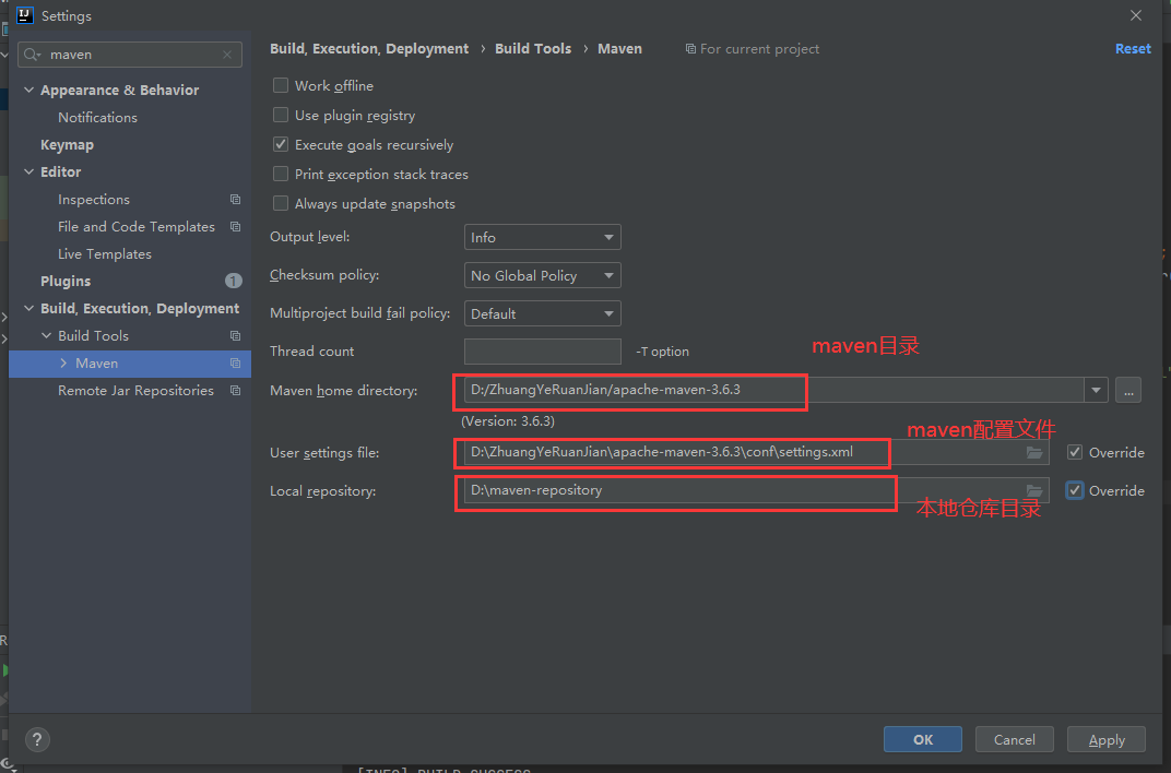 设置IDEA使用本地安装的Maven,并修改配置文件路径(路径根据自己实际情况,我的路径仅供参考)(修改配置文件和本地仓库目录需要选中Override)