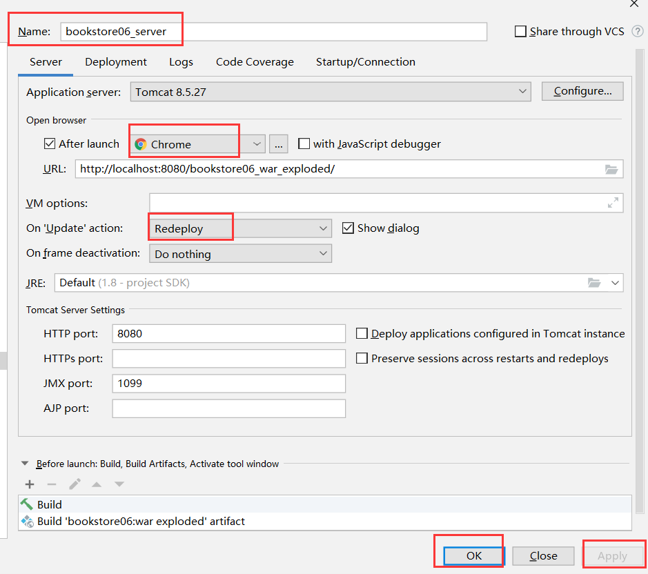 Name命名为“bookstore06_server”,设置为Chrome,Redeploy