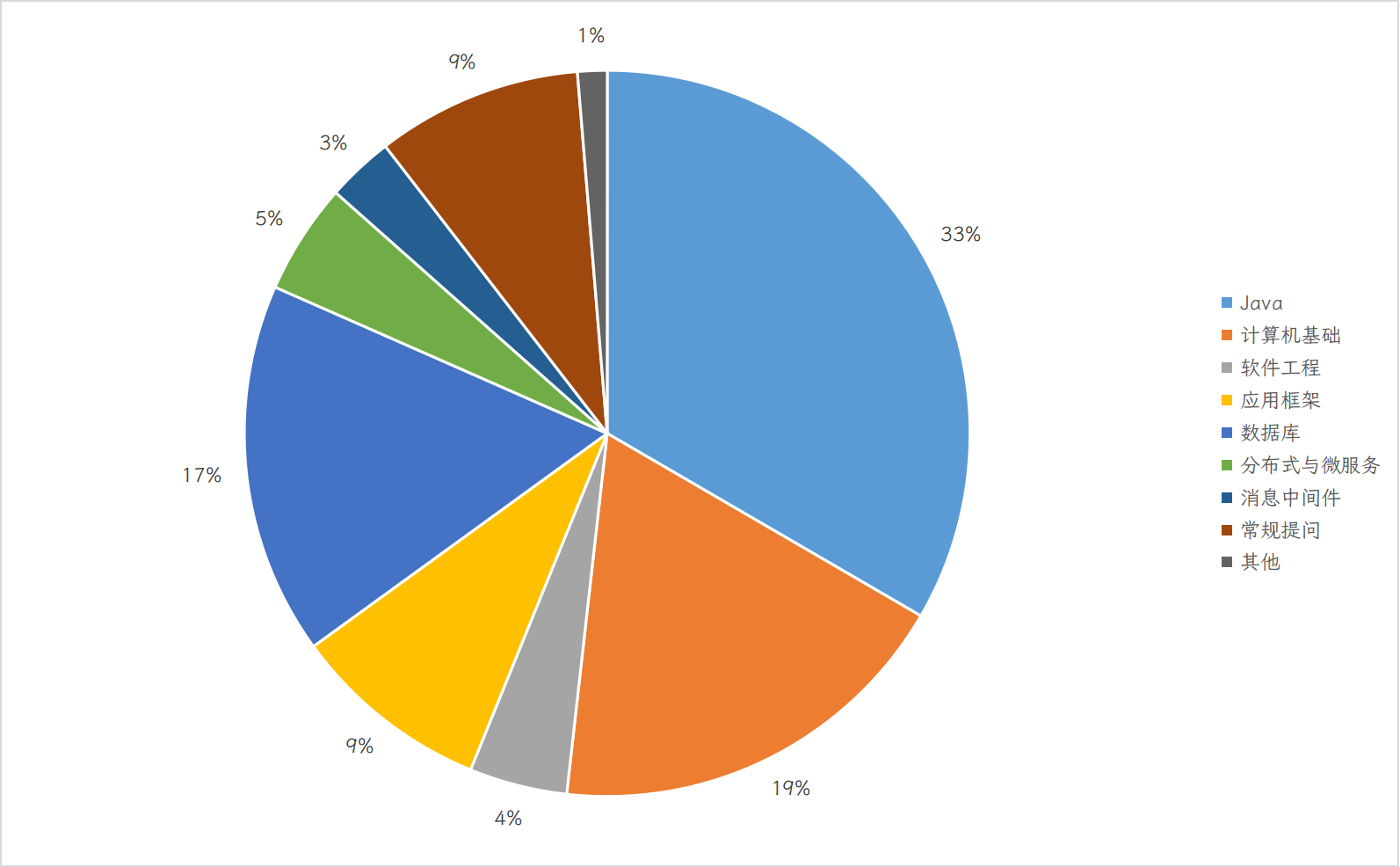 很明显,Java依旧是面试中提问次数最多的,其次是计算机基础和数据库相关的内容,然后就是应用框架和项目相关的内容。