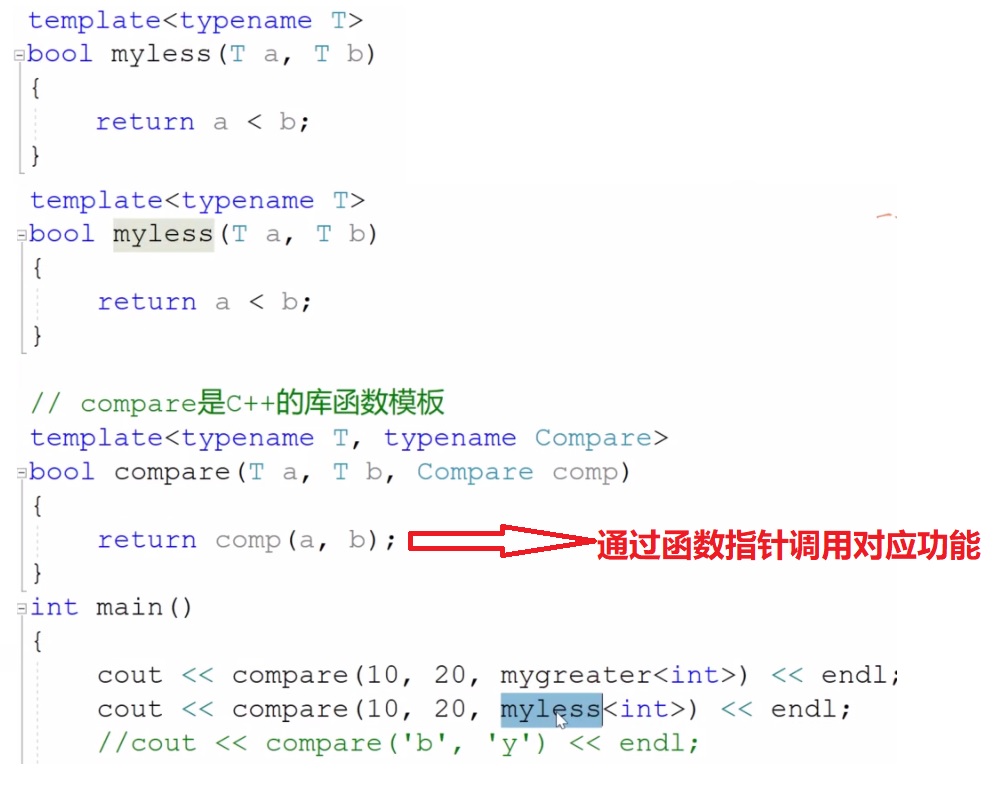 上图中 return comp(a,b);通过函数指针调用函数是没有办法内联的,效率低,因为有函数调用开销,C++通过函数对象解决
