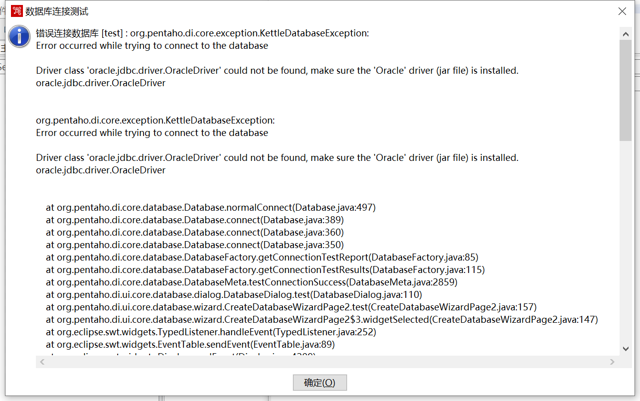 放好以后,需要关掉kettle重启一下才行,我这里放的是ojdbc7,至于其他类型的数据库我还没有测试,不知道是不是也会出现这种情况,如果也出现这种情况的话,就下载一个相对应的驱动,放到data-integrationlib目录下就行